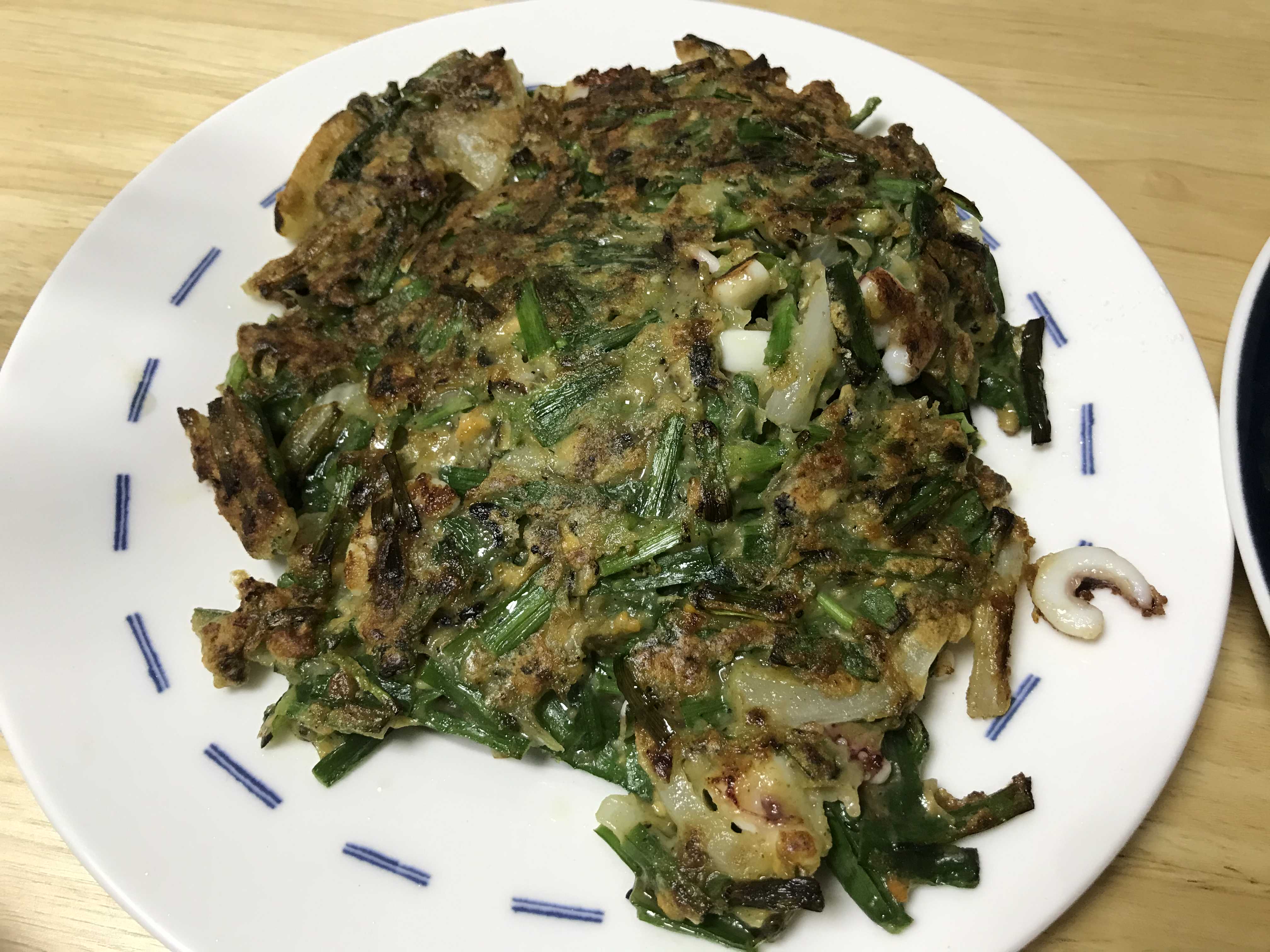 튀김가루를 많이 넣지 않아서 부추 식감도 좋고 중간중간 씹이는 오징어도 홍합에서 고소한 맛까지 나서 맛있었습니다.