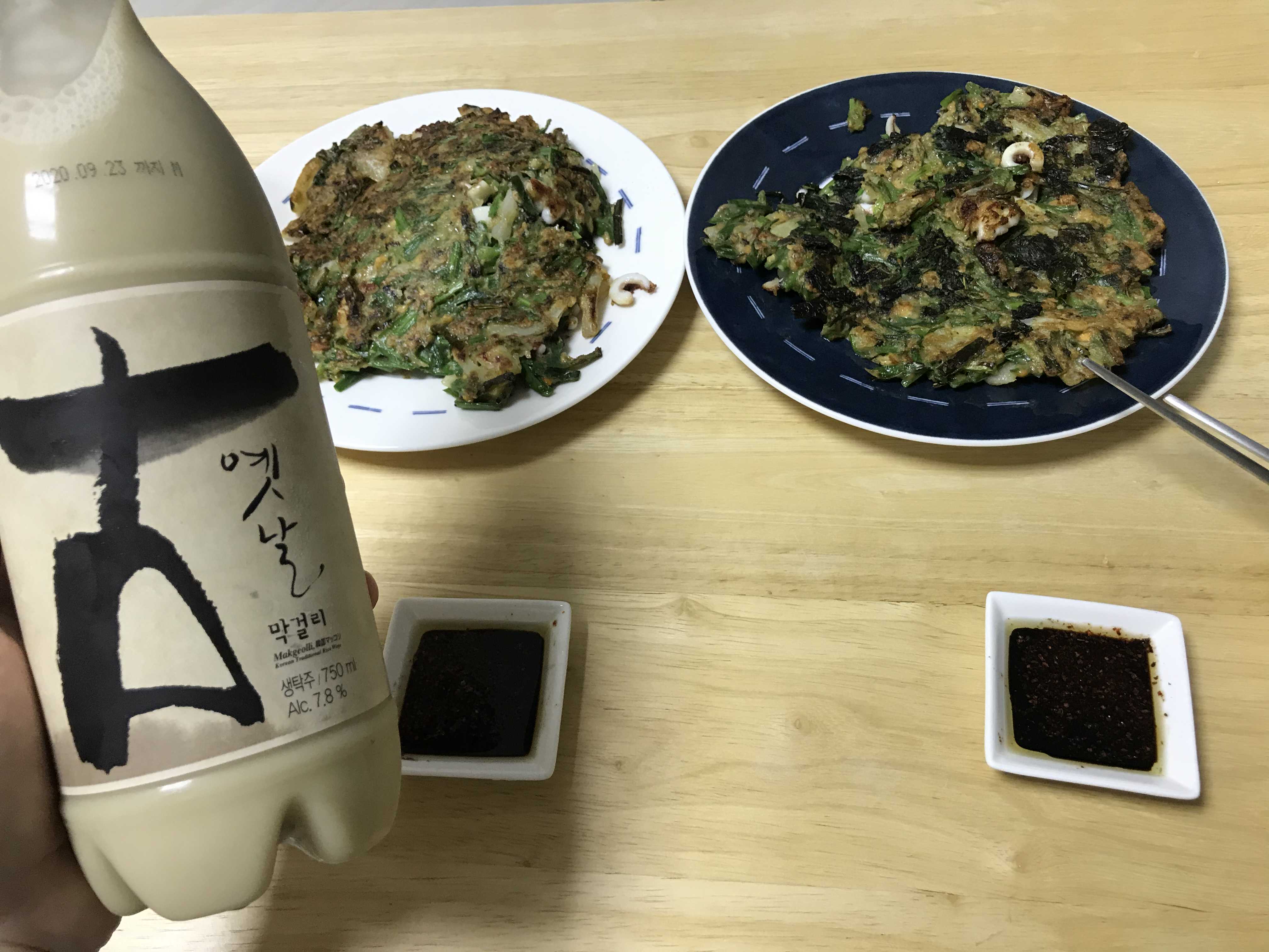 비도오고 밖은 못나가니 가볍게 집에서 해물파전에 막걸리를 먹었습니다.
