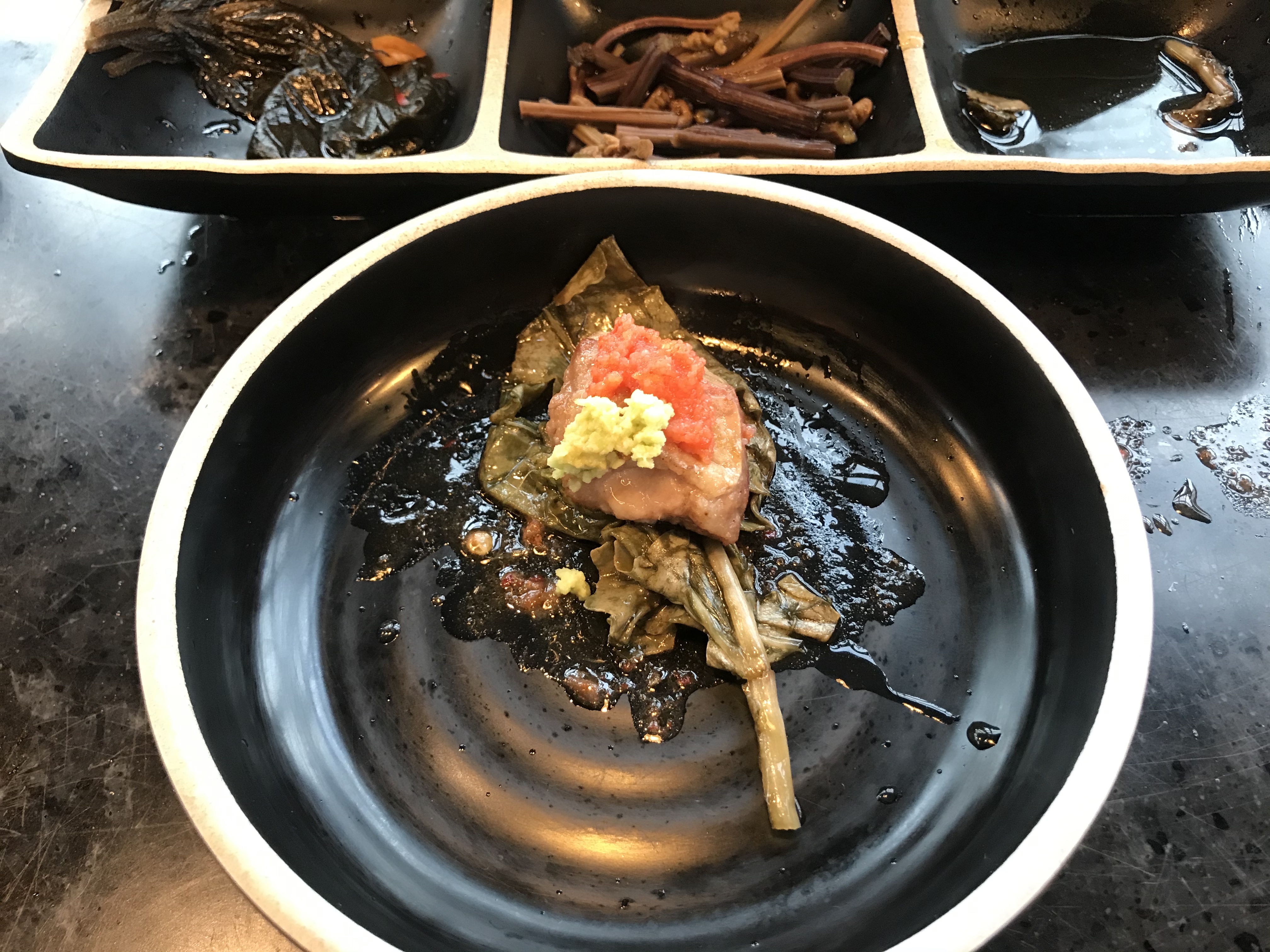 고사리, 깻잎 절임과 갈치속젓, 와사비 등 다양하게 세팅됩니다.