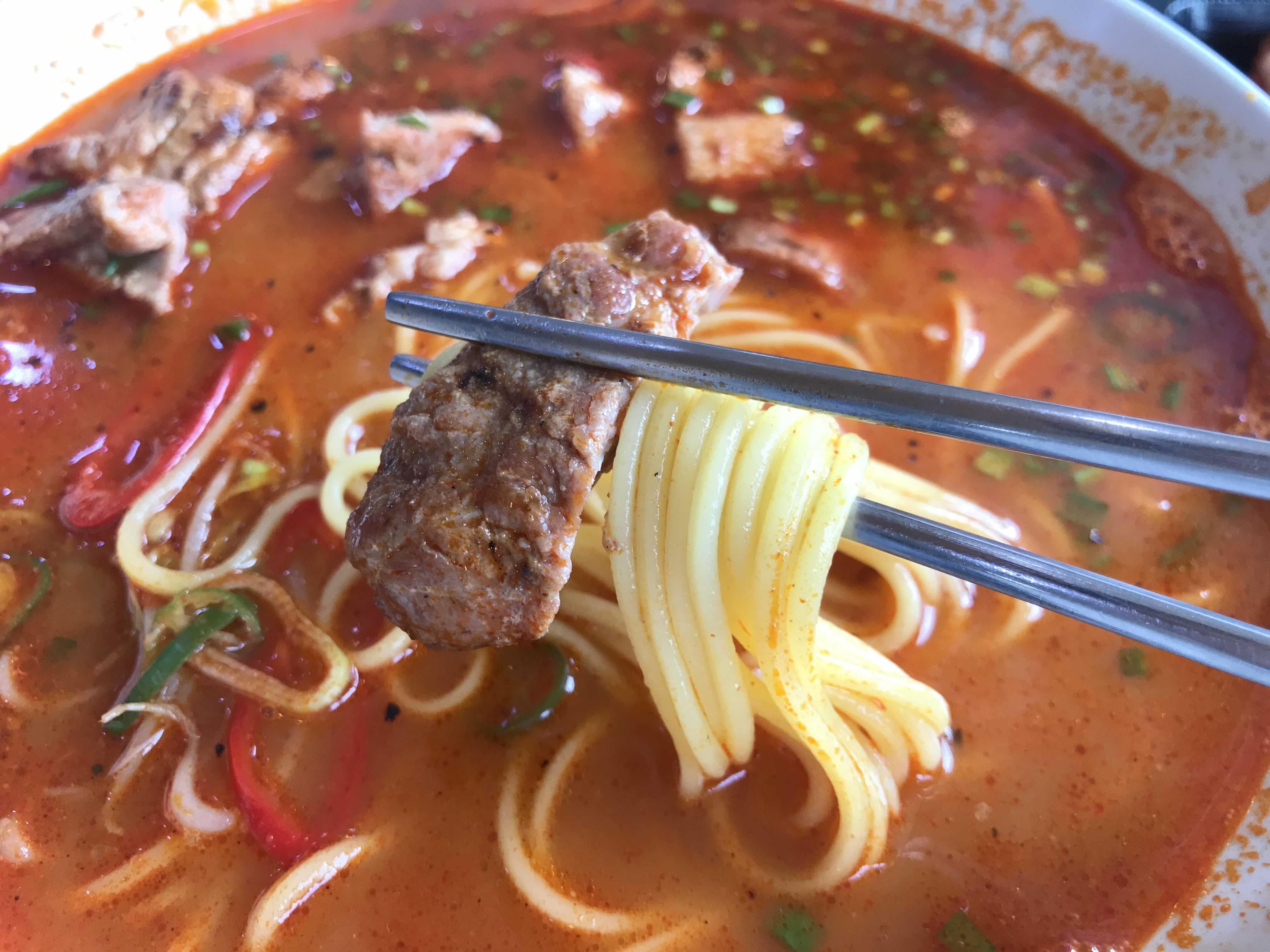 빨간 육수에 쪽파, 홍고추가 올라와있고 큼직한 돼지갈비가 국수위에 올라와있습니다.