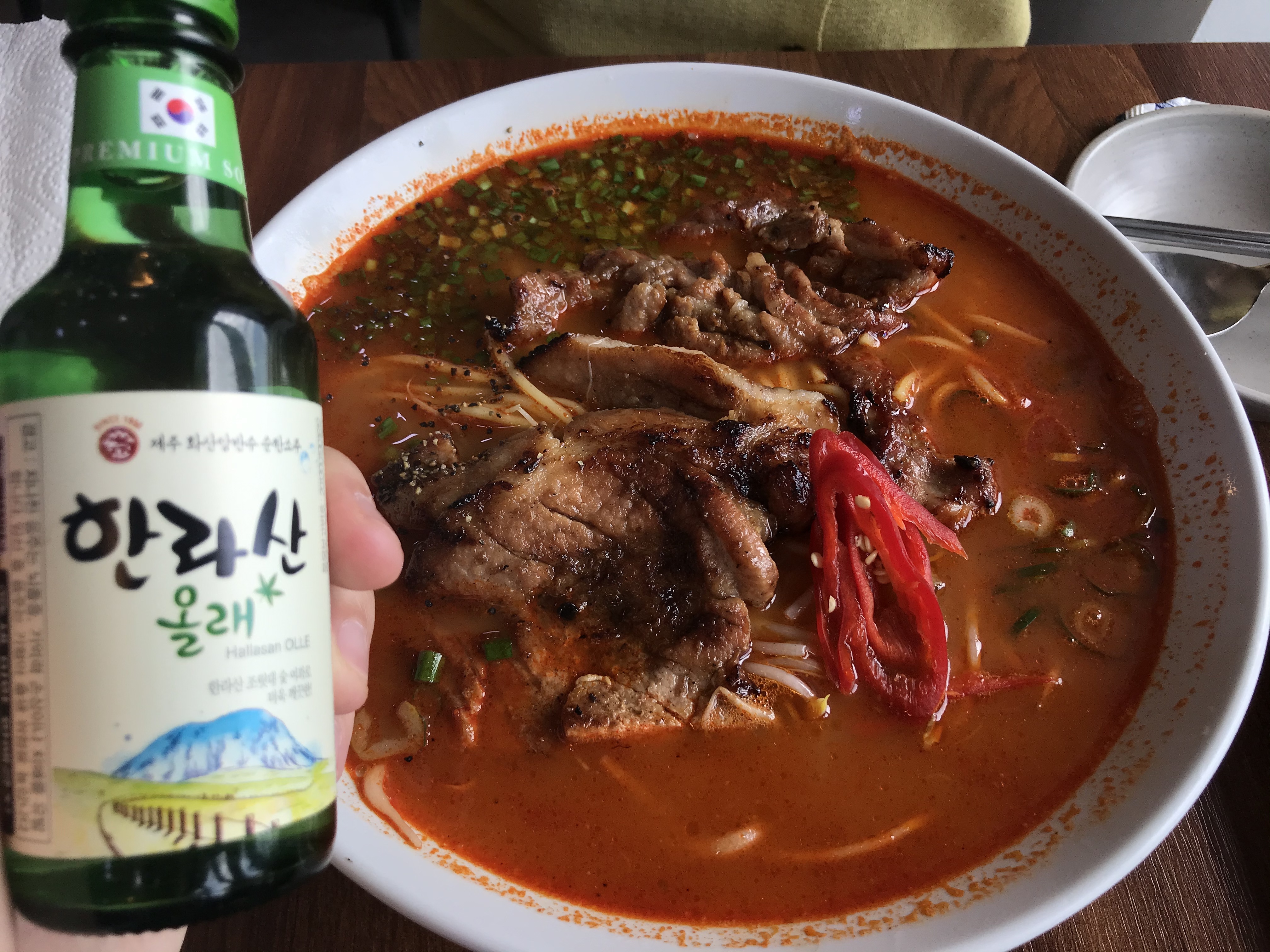 빨간 육수에 쪽파, 홍고추가 올라와있고 큼직한 돼지갈비가 국수위에 올라와있습니다.
