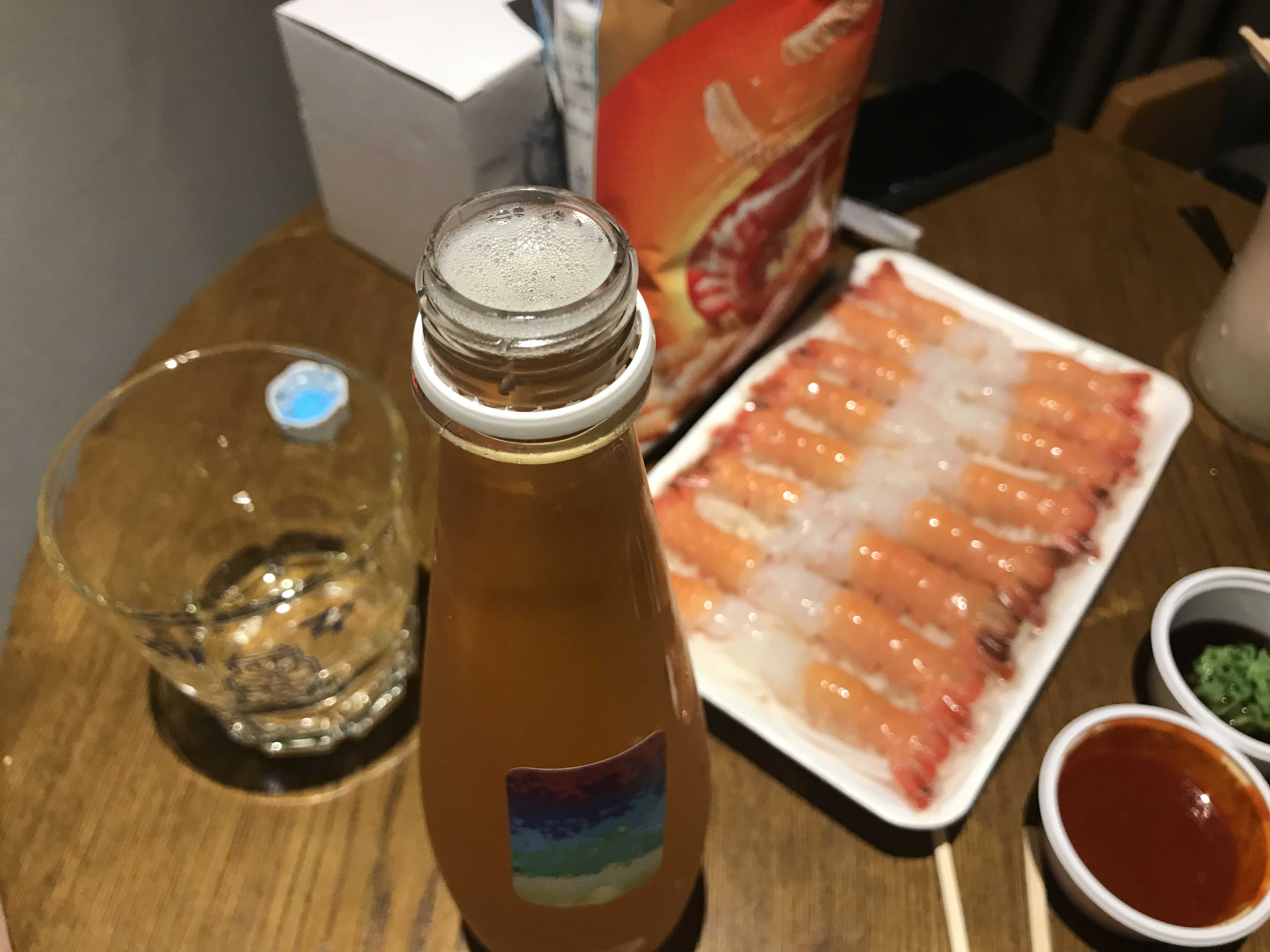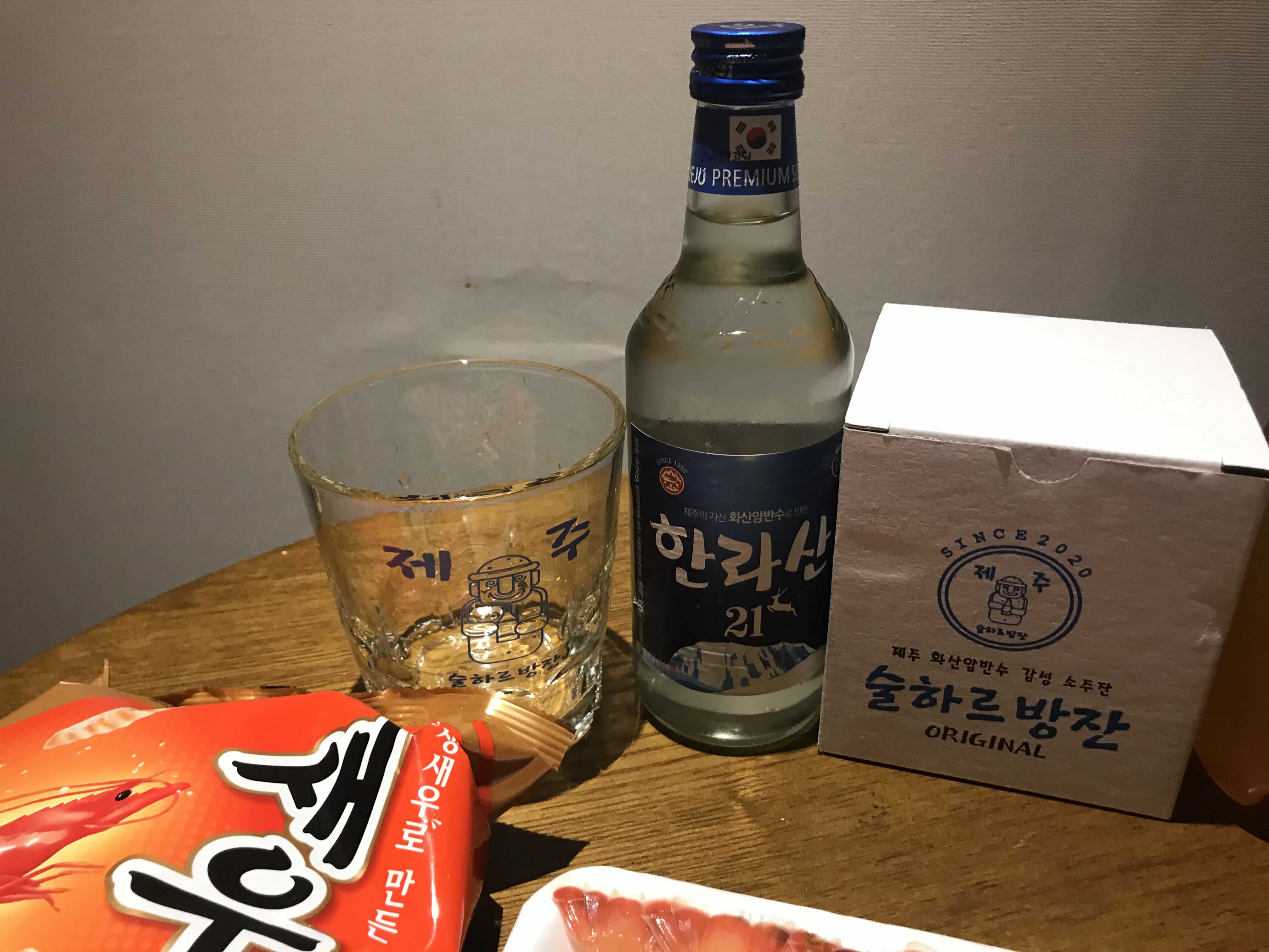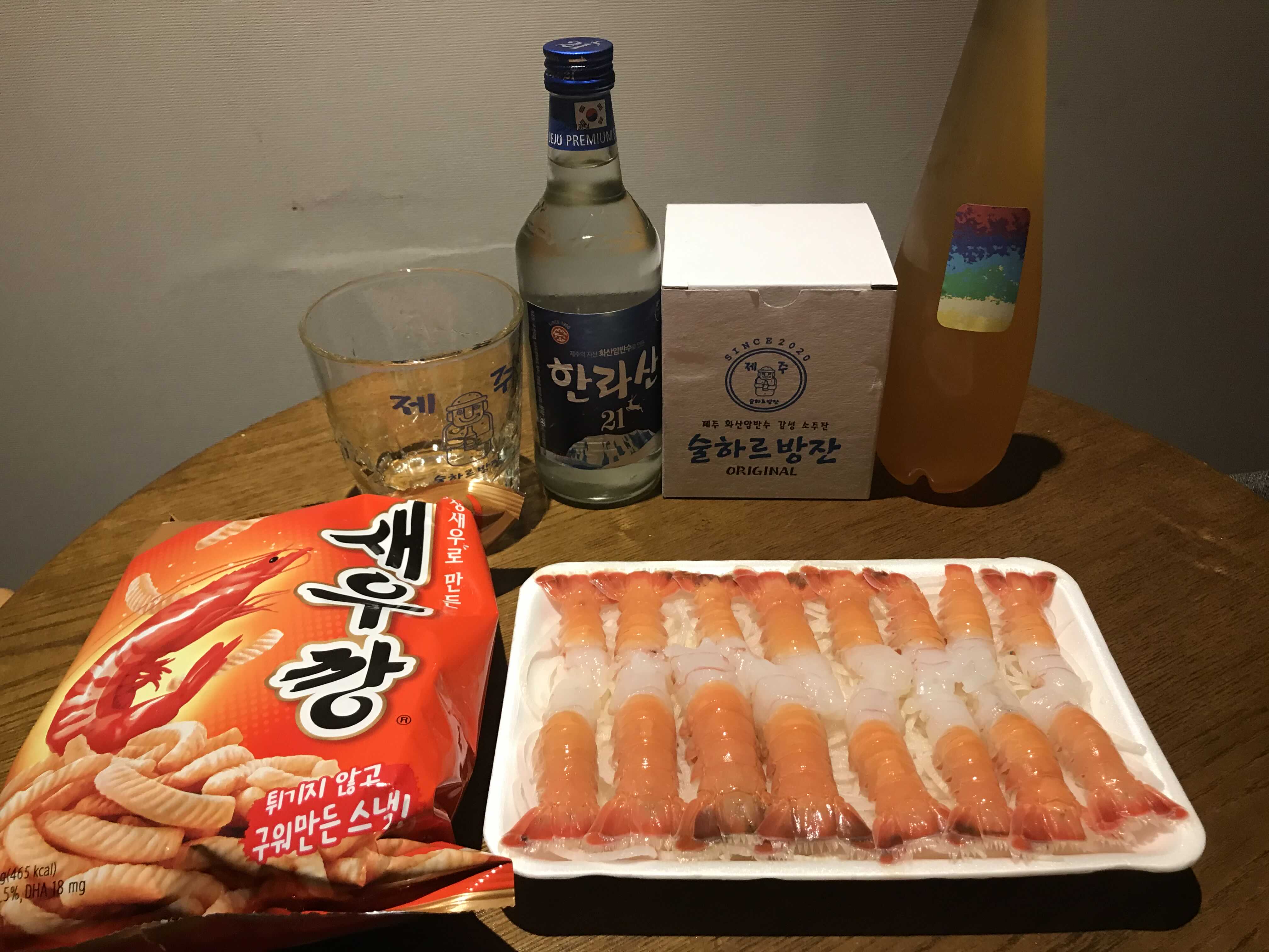 안주로는 새우깡과 딱새우회 술은 한라산 오리지널과 수제맥주를 하나 포장했습니다.
