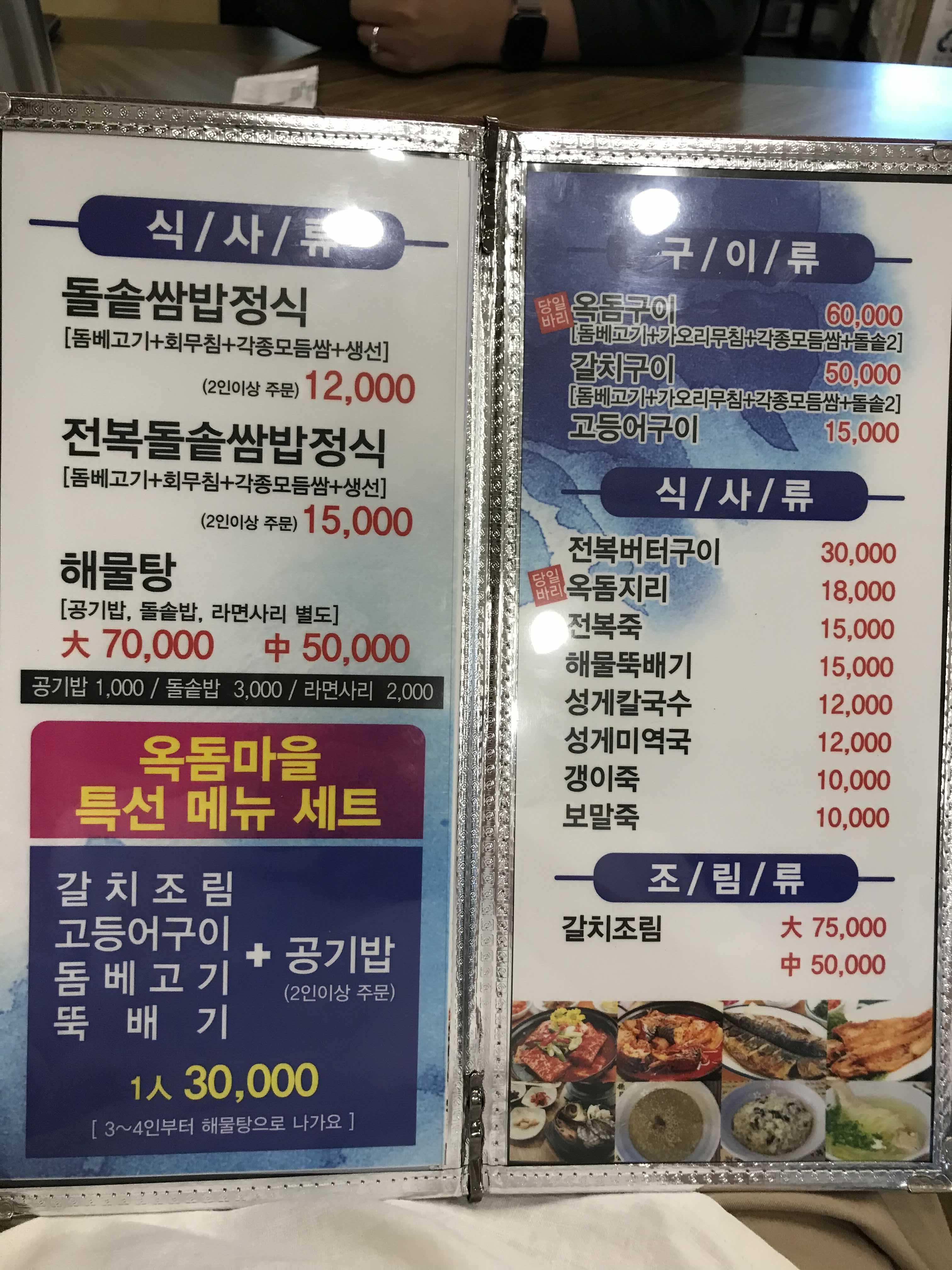 제주도에 온김에 먹어야할 돔베고기 해물뚝배기 갈치조림 모두 있는 옥돔마을로 주문했습니다.